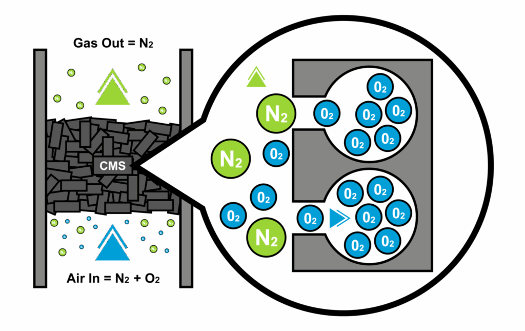 The Pressure Swing Adsorption (PSA) technology is used to separate Nitrogen from Oxygen. This technology relies on two Carbon Molecular Sieve (CMS) columns to produce high-purity Nitrogen from compressed air. The process works as follows: